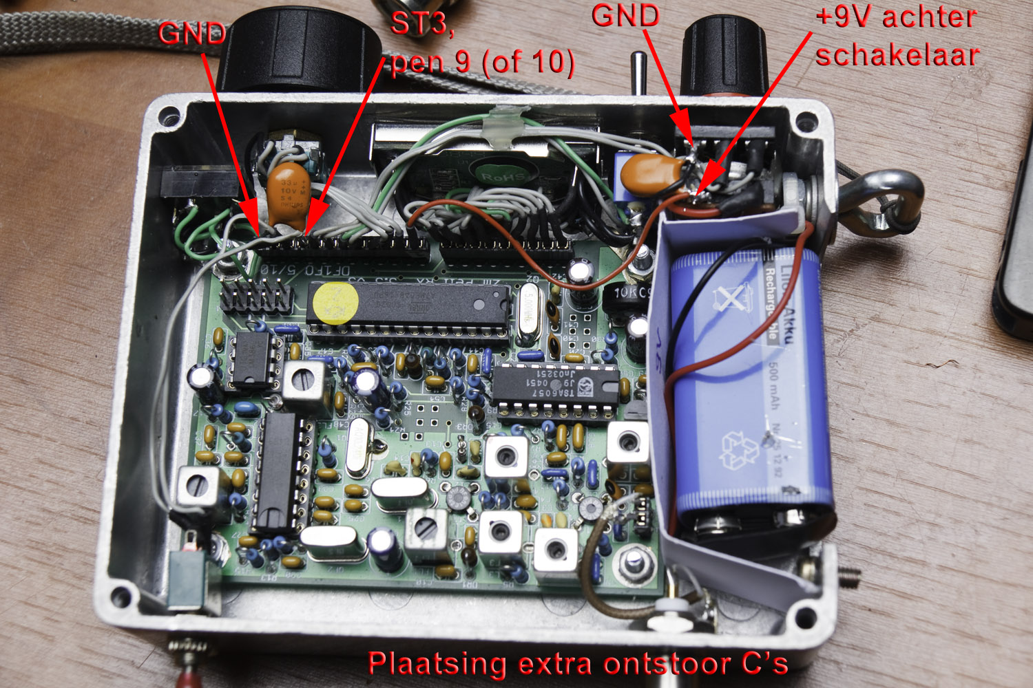 Ik was nog vergeten te zeggen, dat ik gekozen heb voor Li-ion 9V blokjes (eigenlijk zijn ze 8,4-> 7,2V) om deze vossenjacht ontvanger mee te voeden. Goed voor ca. 8 uur bedrijfsduur (ruwe schatting en dit geldt voor de 500mAh blok) op één acculading en vanwege het ontbreken van het geheugeneffect kan het geen kwaad om de accu's tussentijds bij te laden.