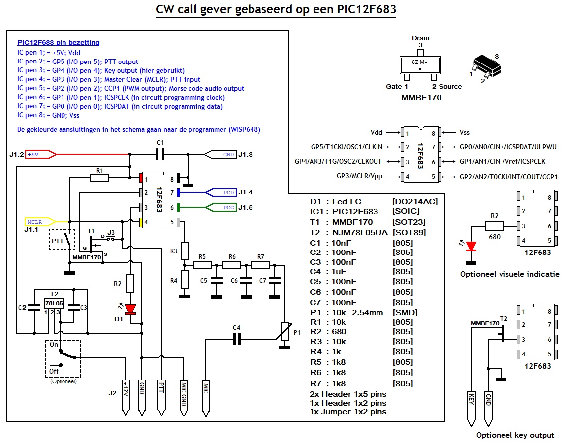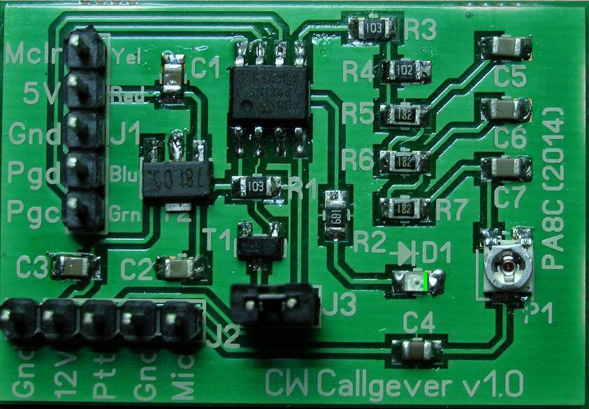 Het betreft hier een eenvoudige CW callgever gebouwd in een PIC processor die éénmaal per 5 minuten uw roepletters in morse zal uitzenden. Aan het begin van een uitzending wordt na ¾ seconden uw identificatie in morse uitgezonden waarna de callgever in een wachtstand van ruim 4 minuten gaat om daarna opnieuw uw roepletters uit te zenden indien u dan nog steeds aan het zenden bent.