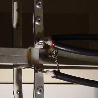 We hebben het vaak wel bevestigd aan de boom, omdat je dan ook de N-connector aan de boom kunt bevestigen. Zodoende heb je die ook gelijk met massa verbonden. Misschien heb je nog wat aan dit fotootje uit de begintijd van onze experimenten.