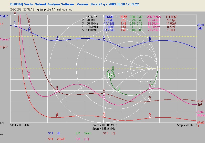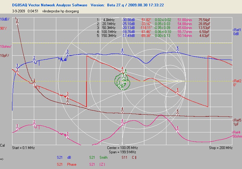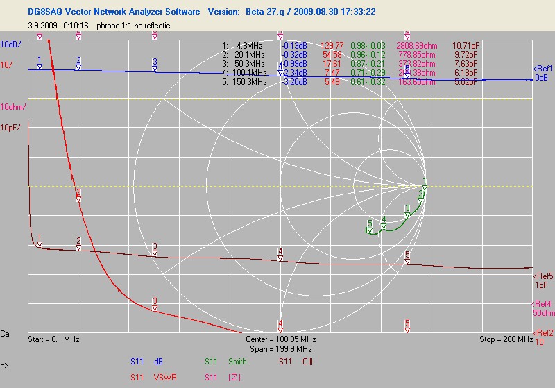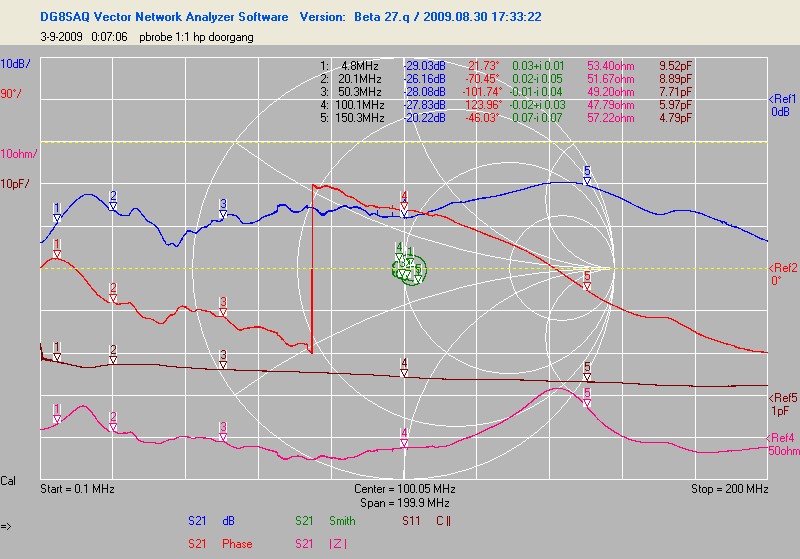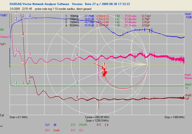 Na hercalibratie van de vna (er is een firmware en software update geweest (nu ook polar en radar plots)) waren de uitkomsten wat logischer. Ik heb een paar probes nog eens gedaan. Dat voelsprietje van HP, de gewone probe die bij de hp zat en een universele probe die ik bij de 150MHz tek kreeg.