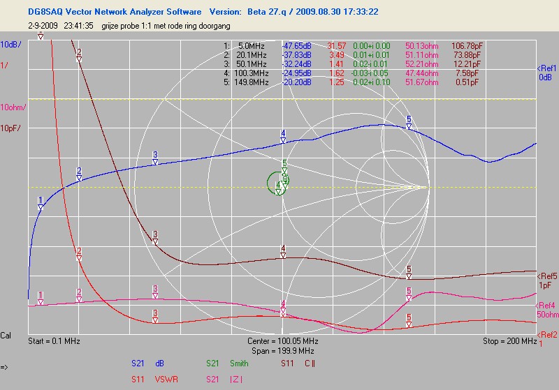 Ik heb een doorgangsmeting gedaan. Dus de bnc van de probe-kabel op de 50 ohm uitgang van de analayser en de probe zelf op ingang. Een probe is natuurlijk voor een 1M ohm scoop gemaakt en niet voor 50 ohm. Het stomme is echter dat in het gebied tot ongeveer 100MHz de probes een behoorlijke capaciteit hadden, 10-20dB demping, Een hoge swr maar daarboven een wordt de swr beter, de capaciteit negatief (inductief dus) en het insertion loss beter. Sommige gaven tot 1GHz een redelijk vlak beeld, andere zaten vol pieken en dalen.