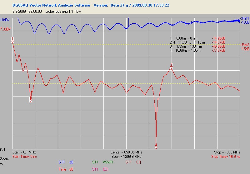 Ook nog even een TDR gedaan van de probe. Eerste in de stand 1:10 en daarna als 1:1. Bij 1:1 is een dip te zien en bij 1:10 niet. Normaal duidt dat op een short, Vreemd. Zou dat de capaciteit van de probe zijn ? Je ziet ook de overgang van compensatie/bnc houder naar kabel