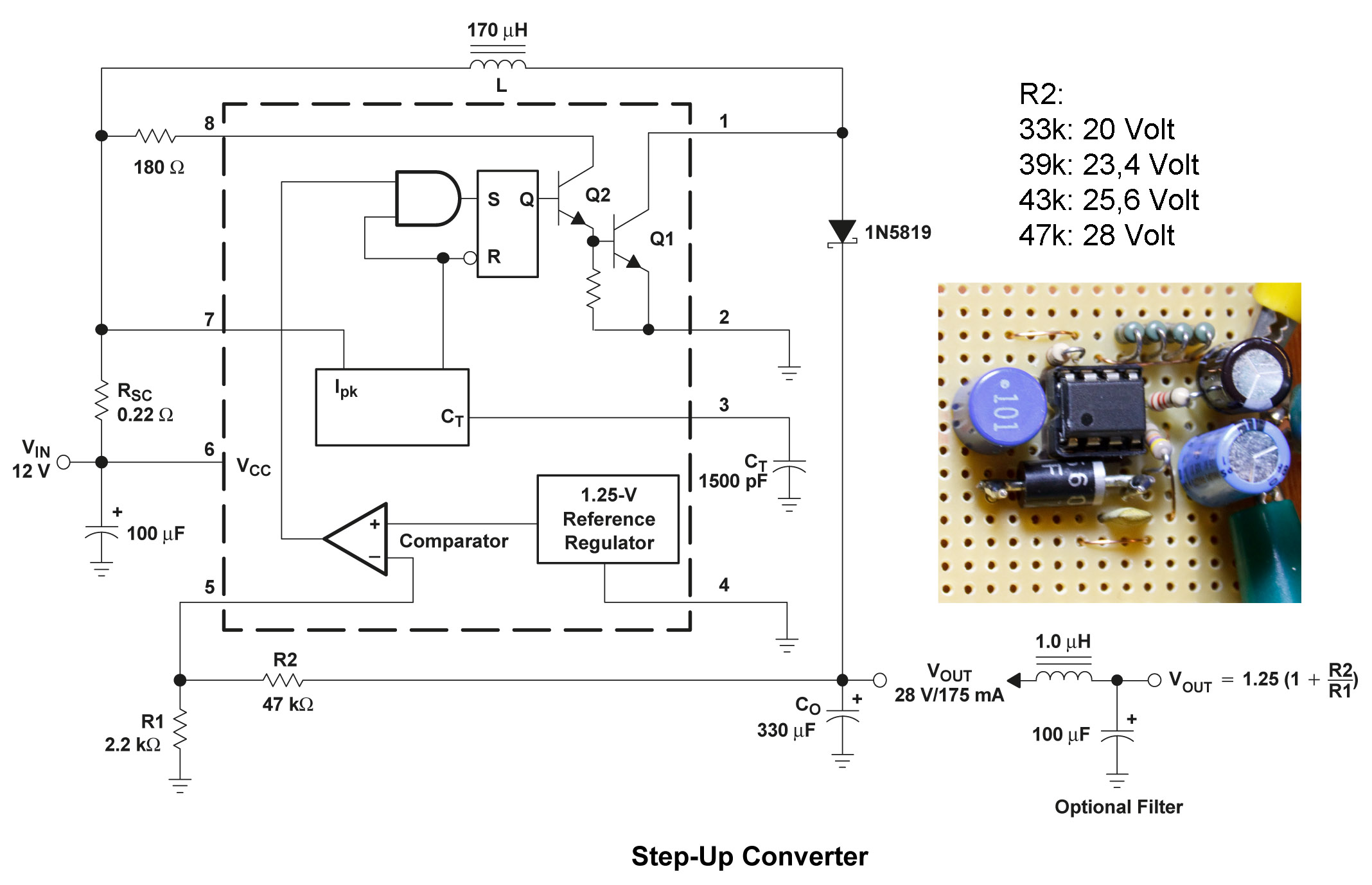 De eerder genoemde step-up converter maakt van 5-15V ongeveer 28V. Deze uitgangsspanning wordt bepaald door bepaalde waarden van twee weerstanden (R1 en R2) in de schakeling van de step-up converter te berekenen. Ik wilde weleens proberen of de uitgangsspanning kon worden verlaagd als ik een weerstandje parallel schakelde, terwijl de step-up converter ingeschakeld was.