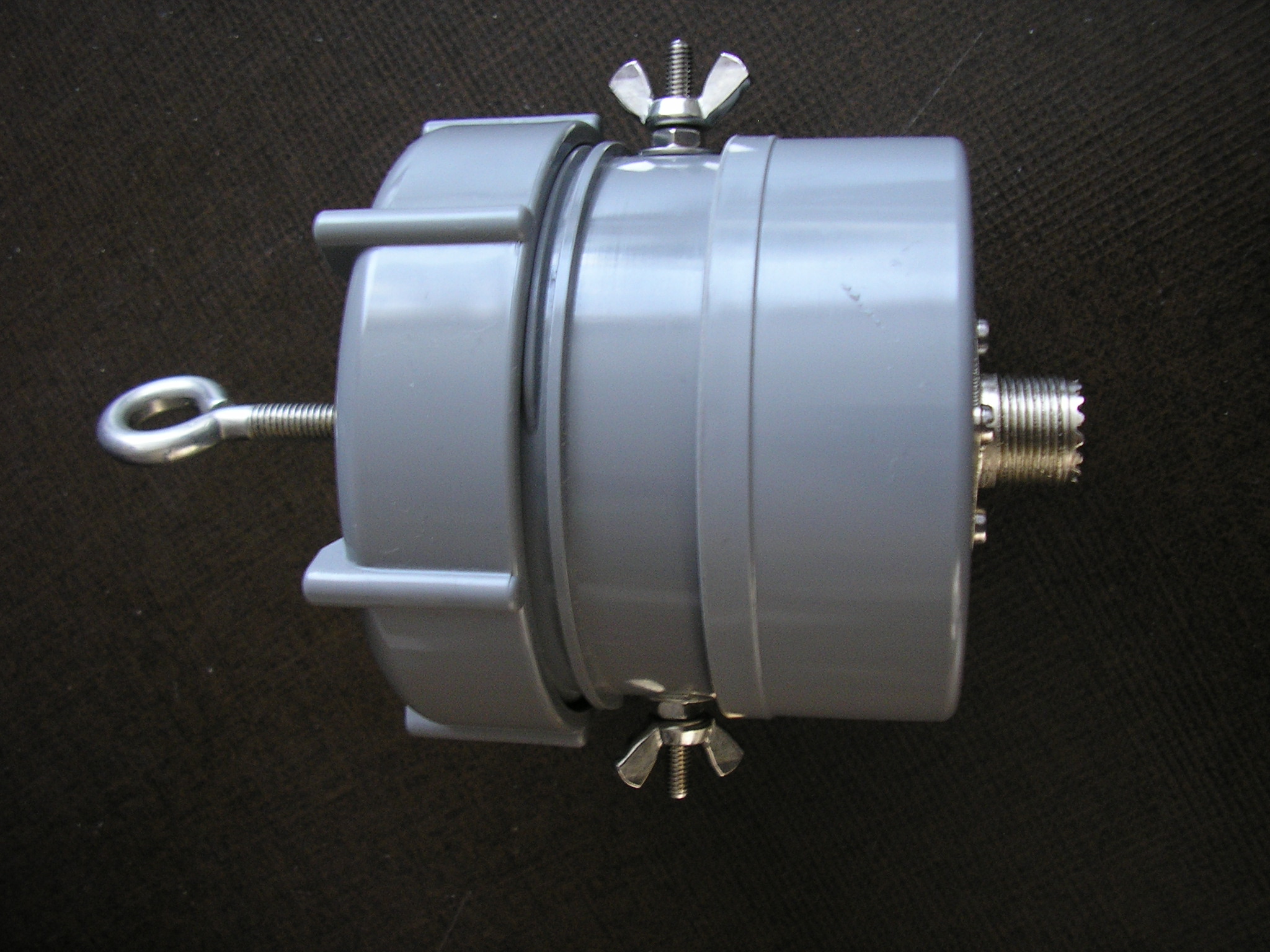 Maar het kan makkelijker. Gewoon stukje grijze buis. Daaronder lijm je een afsluitdop en maak je de SO239, de bovenkant kun je ook zo dichtlijmen of van een schroefdopvoorzien.
